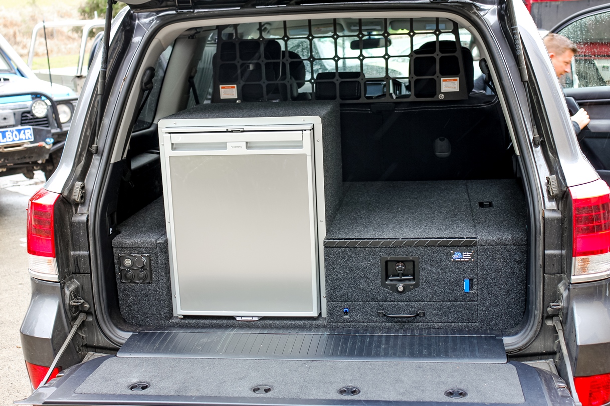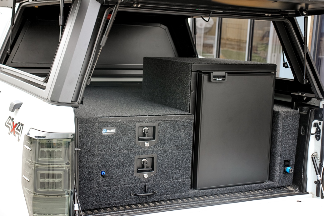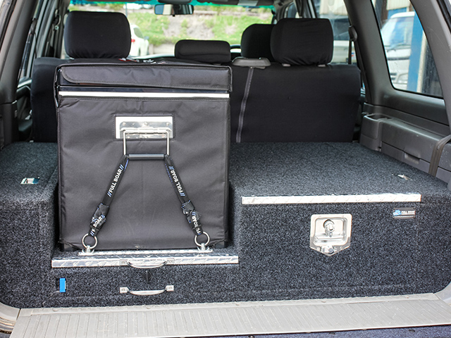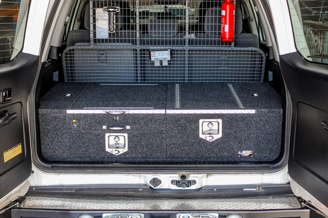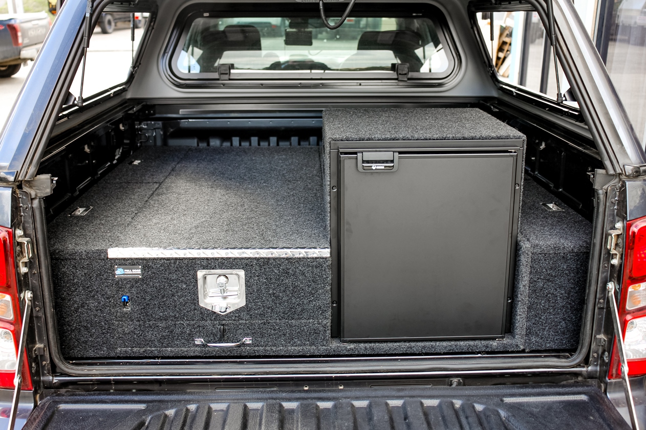 This is our 2 drawer system with a built in heavy duty fridge slide above one drawer. Can be made to suit any wagon or dual cab vehicle. Side wing kit is included. Width and depth vary to each specific vehicle.