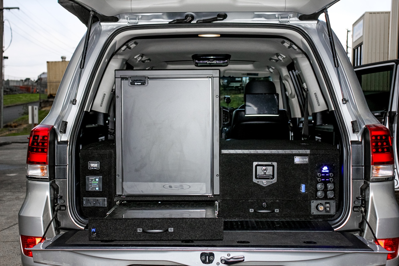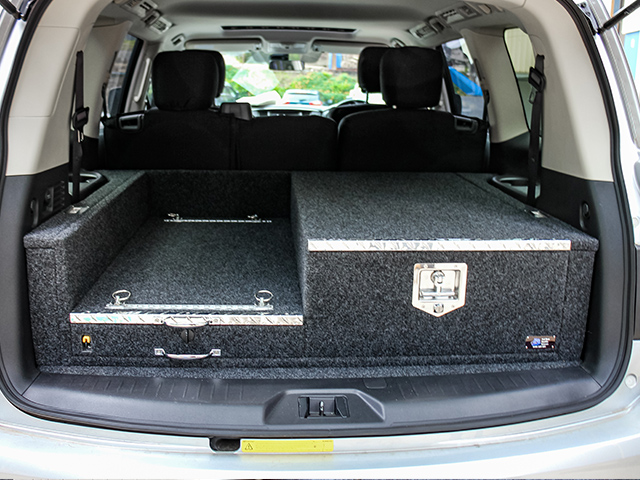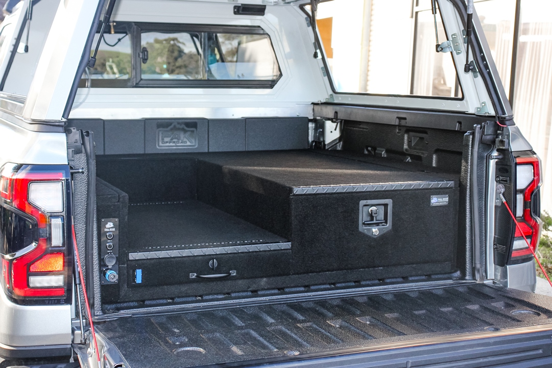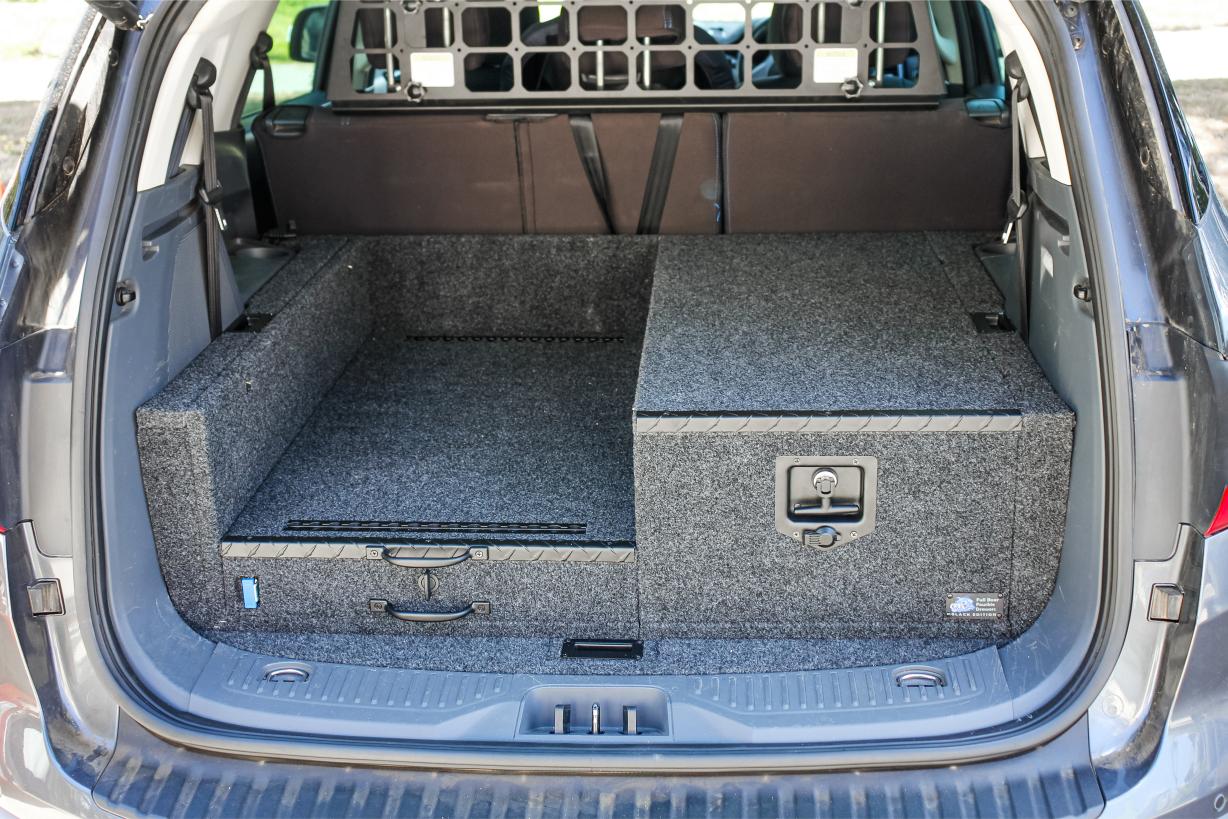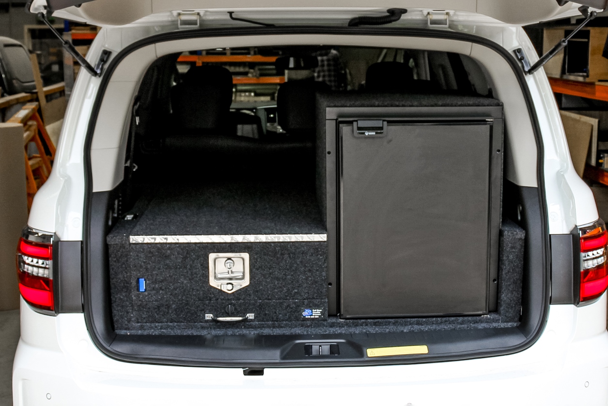 This is our 2 drawer system with a built in heavy duty fridge slide above one drawer. Can be made to suit any wagon or dual cab vehicle. Side wing kit is included. Width and depth vary to each specific vehicle.
