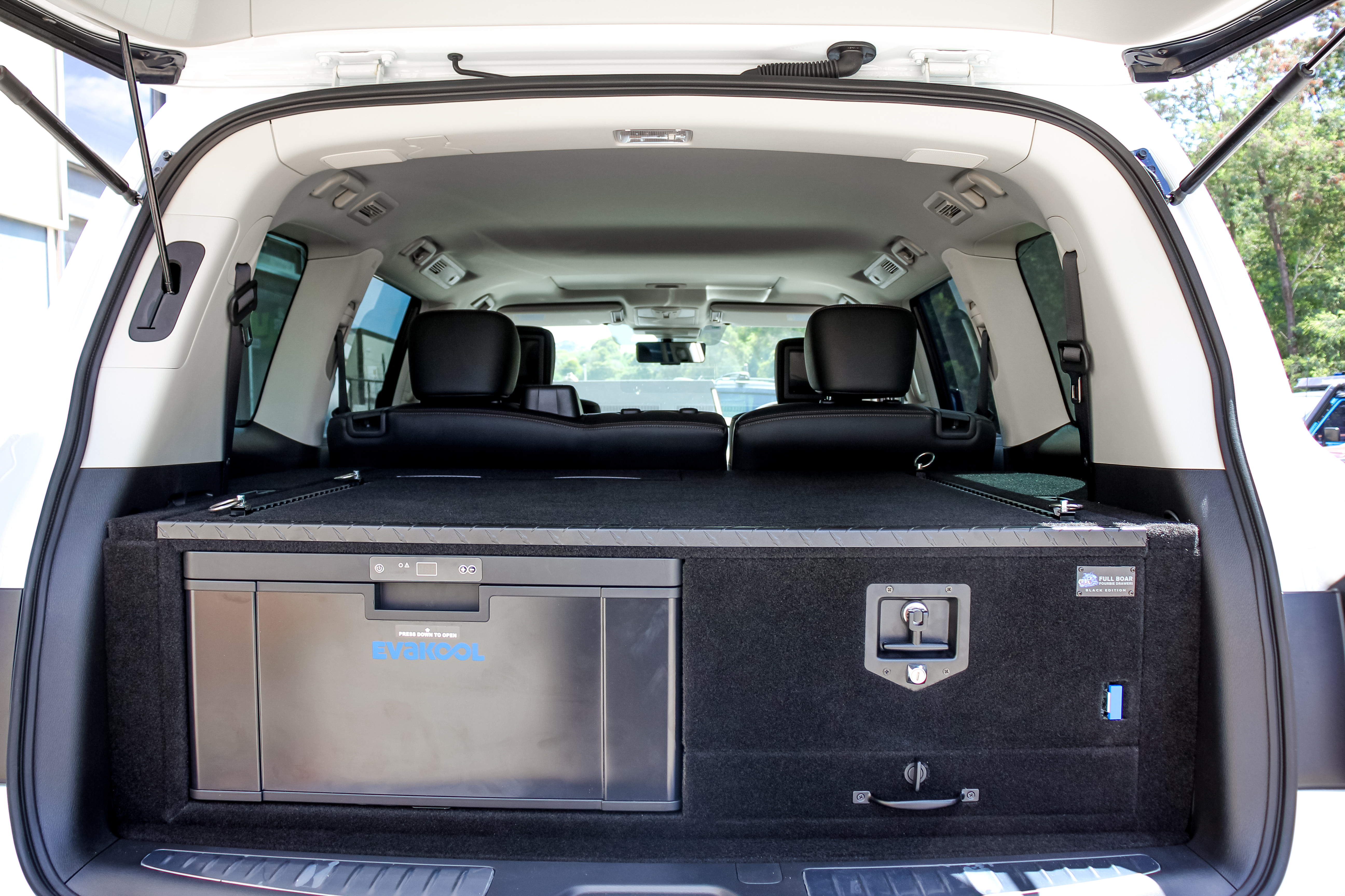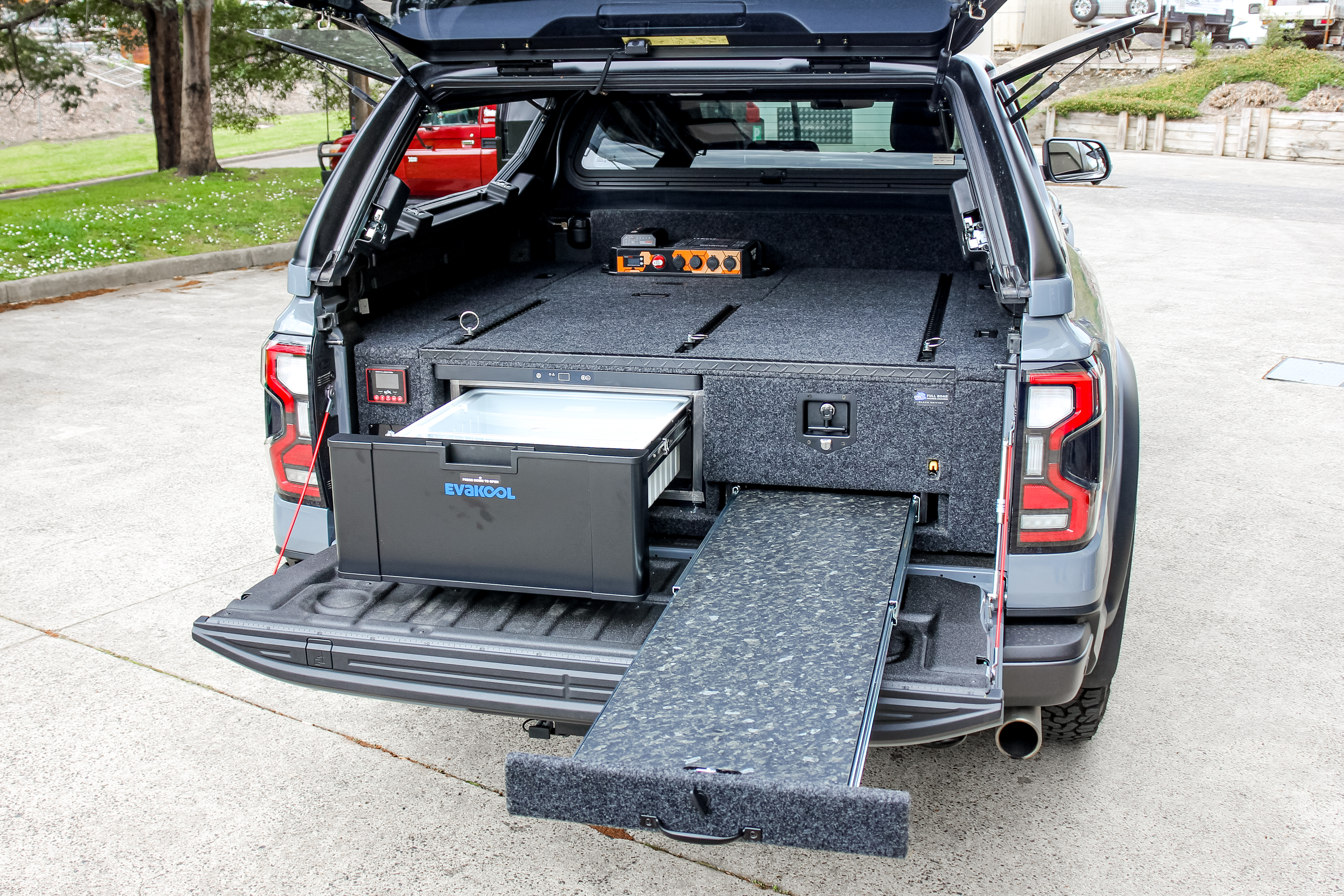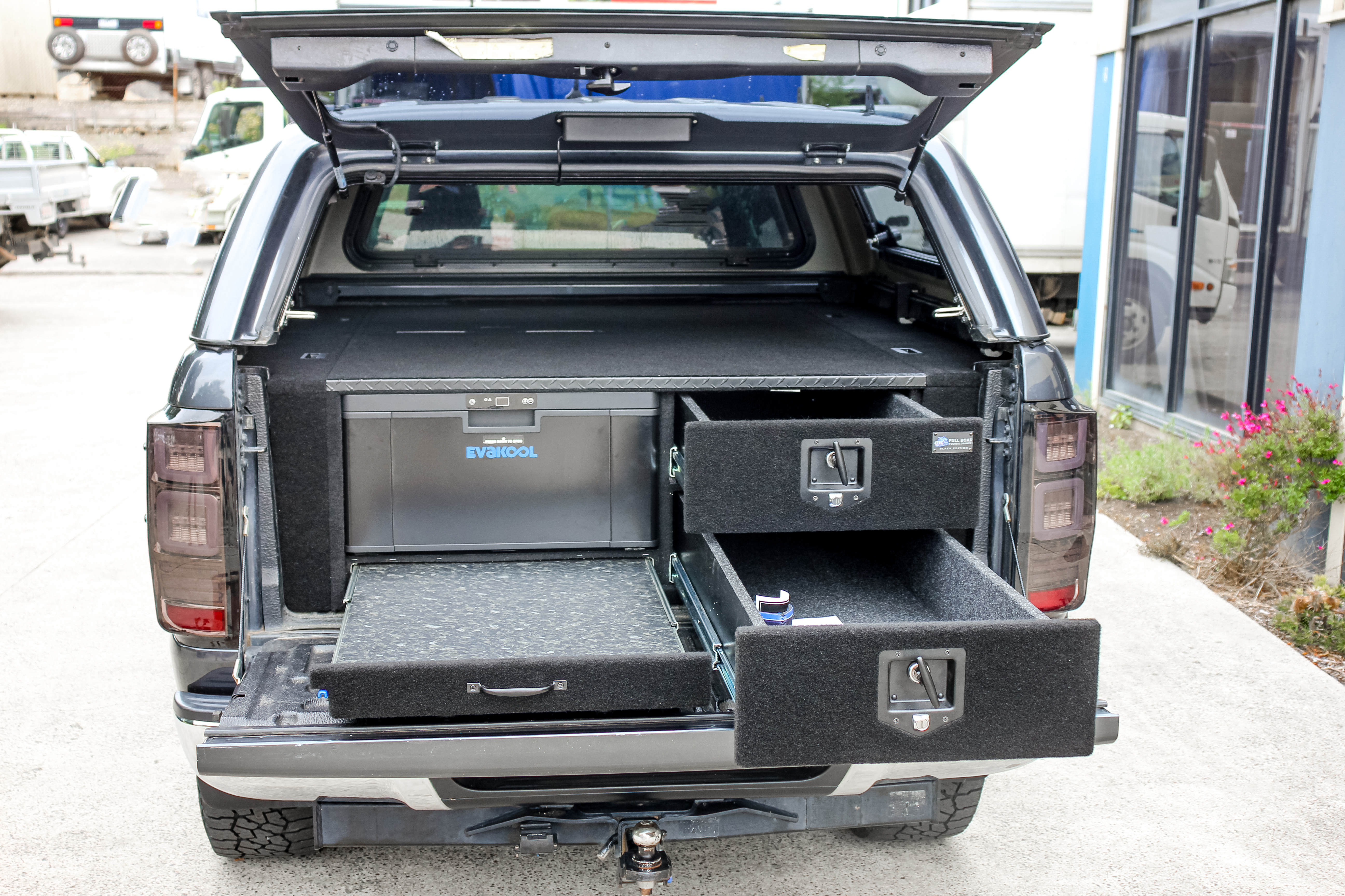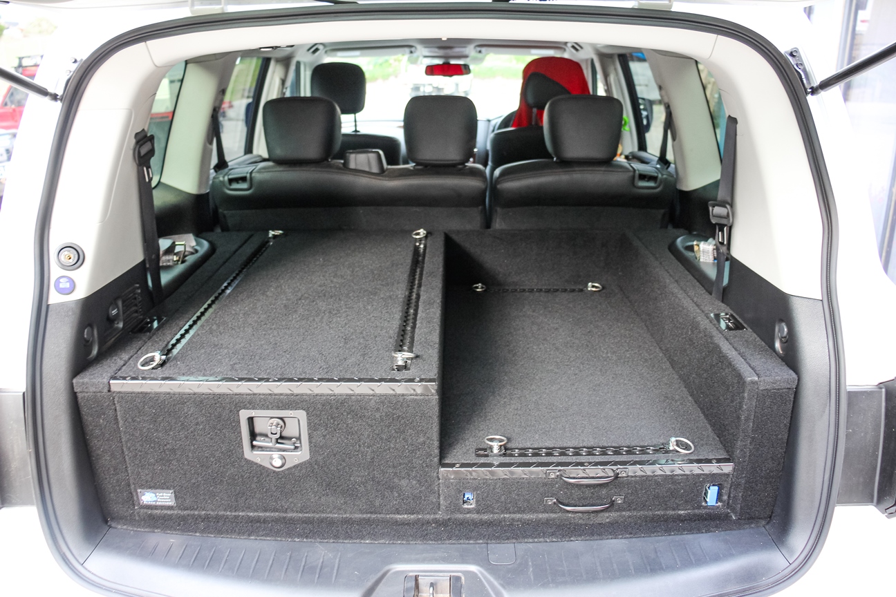 This is our 2 drawer system with a built in heavy duty fridge slide above one drawer. Can be made to suit any wagon or dual cab vehicle. Side wing kit is included. Width and depth vary to each specific vehicle.
