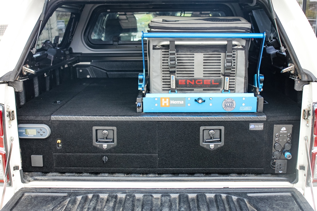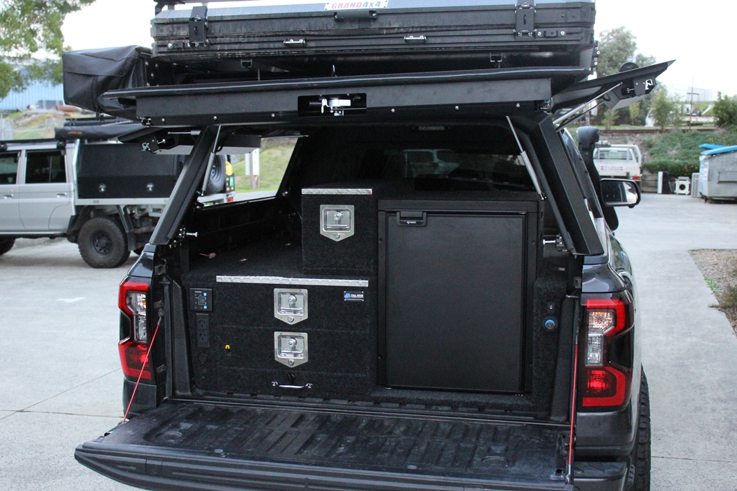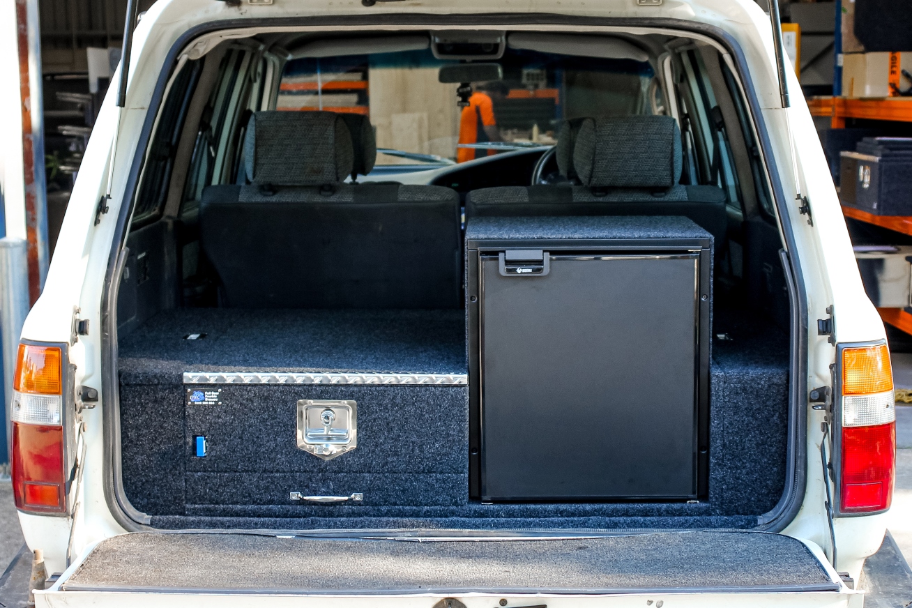 This is our most popular system. The single drawer system with fridge slide down low. Can be made to suit any wagon or dual cab vehicle. Side wing kit is included. Width and depth vary to each specific vehicle.